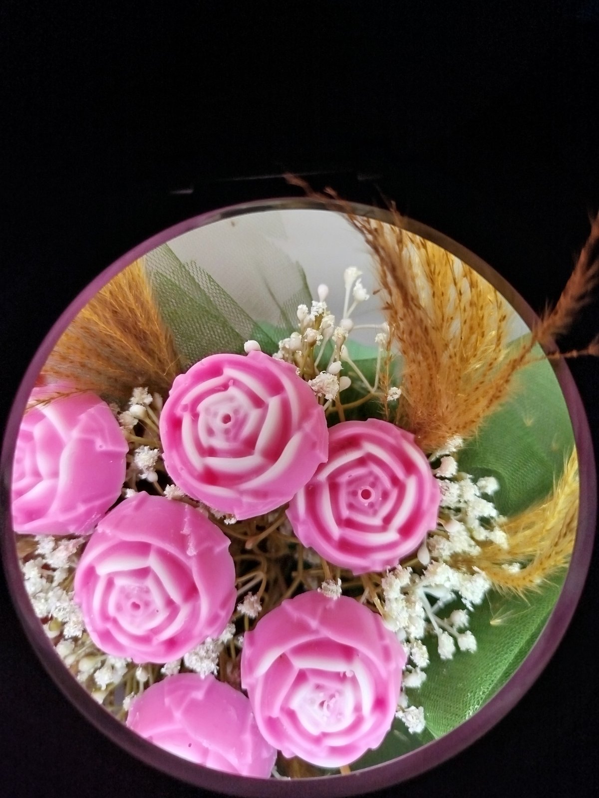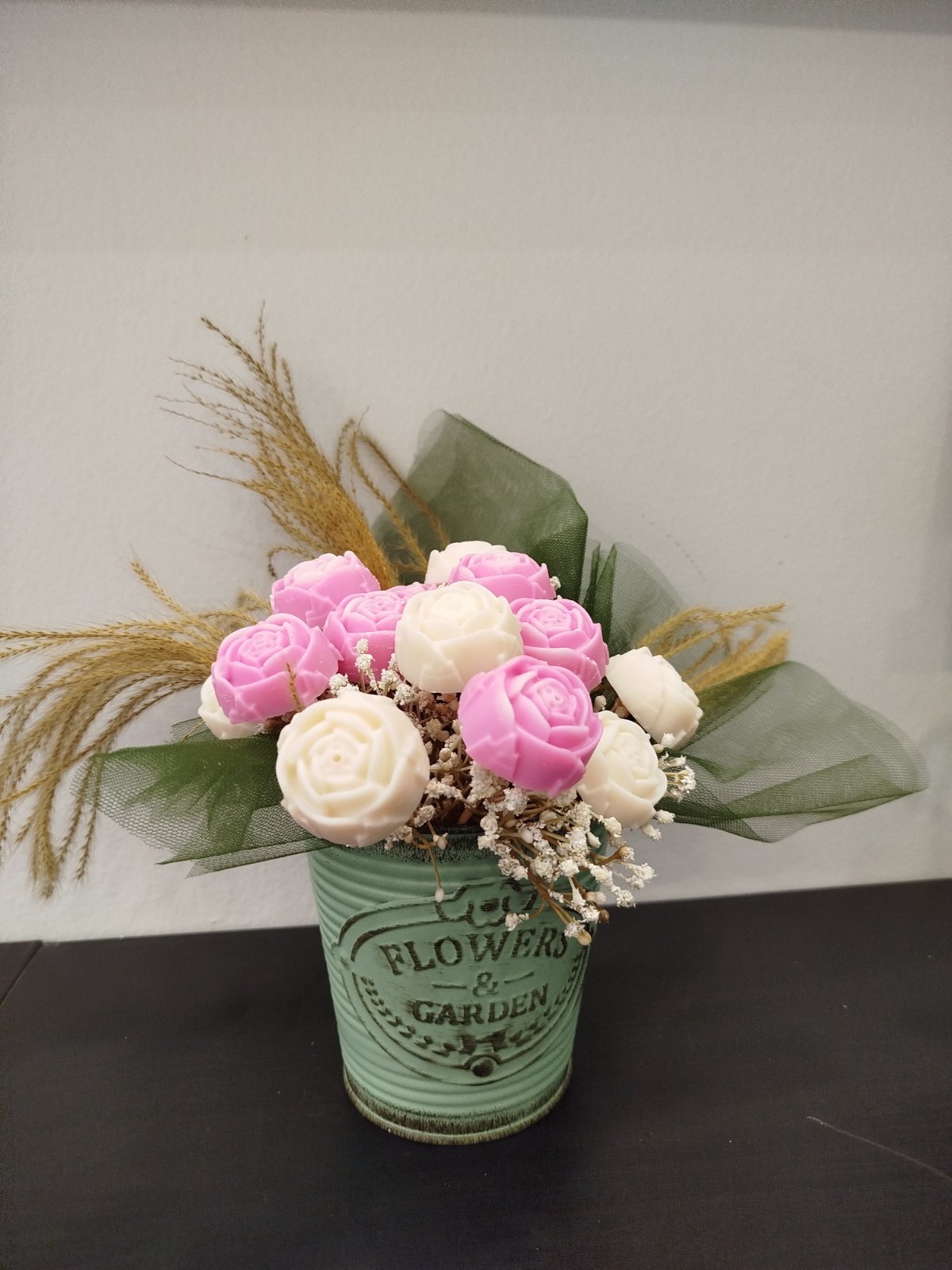 Αρωματικό μπουκέτο από ροζ κέρινα τριαντάφυλλα με άρωμα white musk σε διακοσμητικό γλαστράκι. Μπορείτε να αφαιρέσετε τα λουλούδια και να τα χρησιμοποιήσετε σαν wax melts ή να χρησιμοποιήσετε ολόκληρη την ανθοδέσμη σαν διακοσμητικό αρωματικό χώρου.