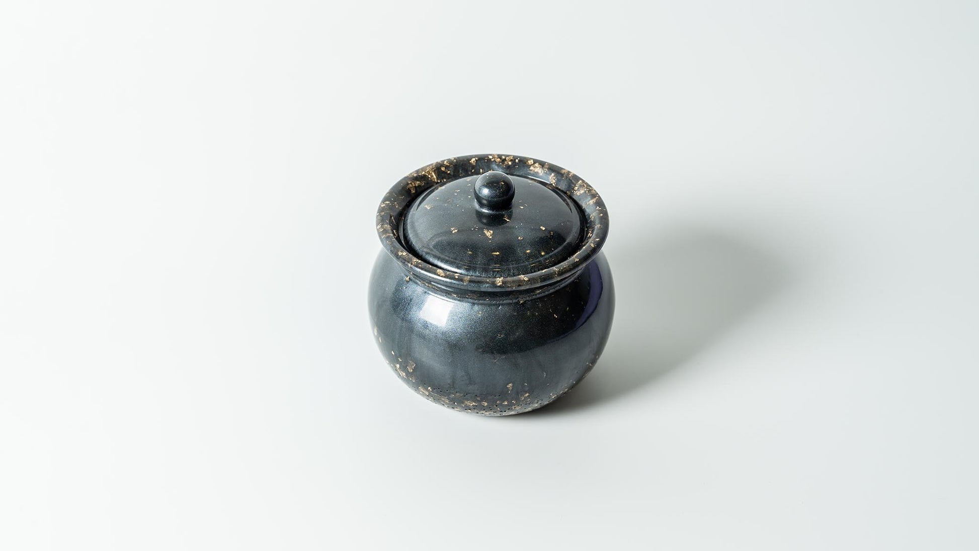 Χειροποίητο μπολ με καπάκι από υγρό γυαλί σε αποχρώσεις μαύρου με φύλλα χρυσού. Διατίθεται και σε άλλα χρώματα κατόπιν παραγγελίας με χρόνο παράδοσης 1 εβδομάδα.