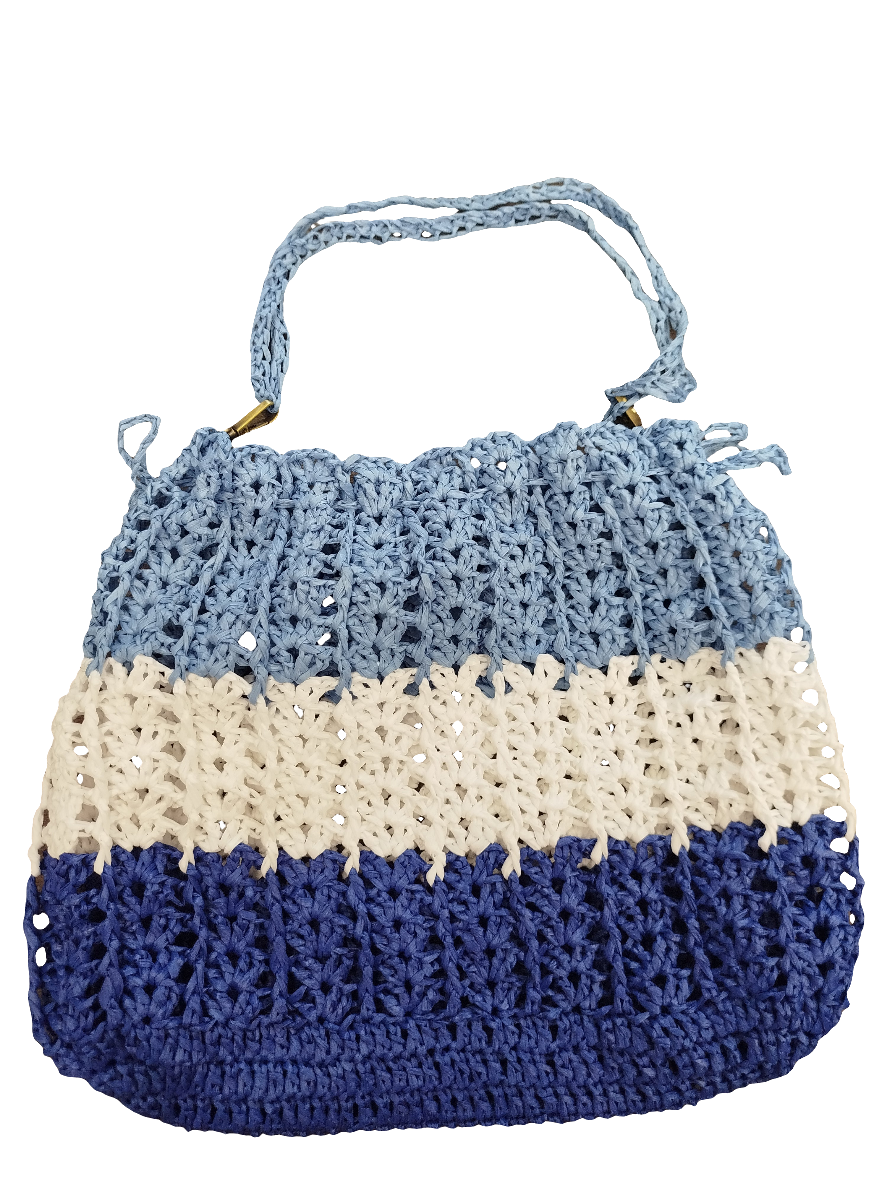 Χειροποίητη πλεκτή ψάθινη τσάντα με τριχρωμία σε μπλε, άσπρο, γαλάζιο χρώμα.