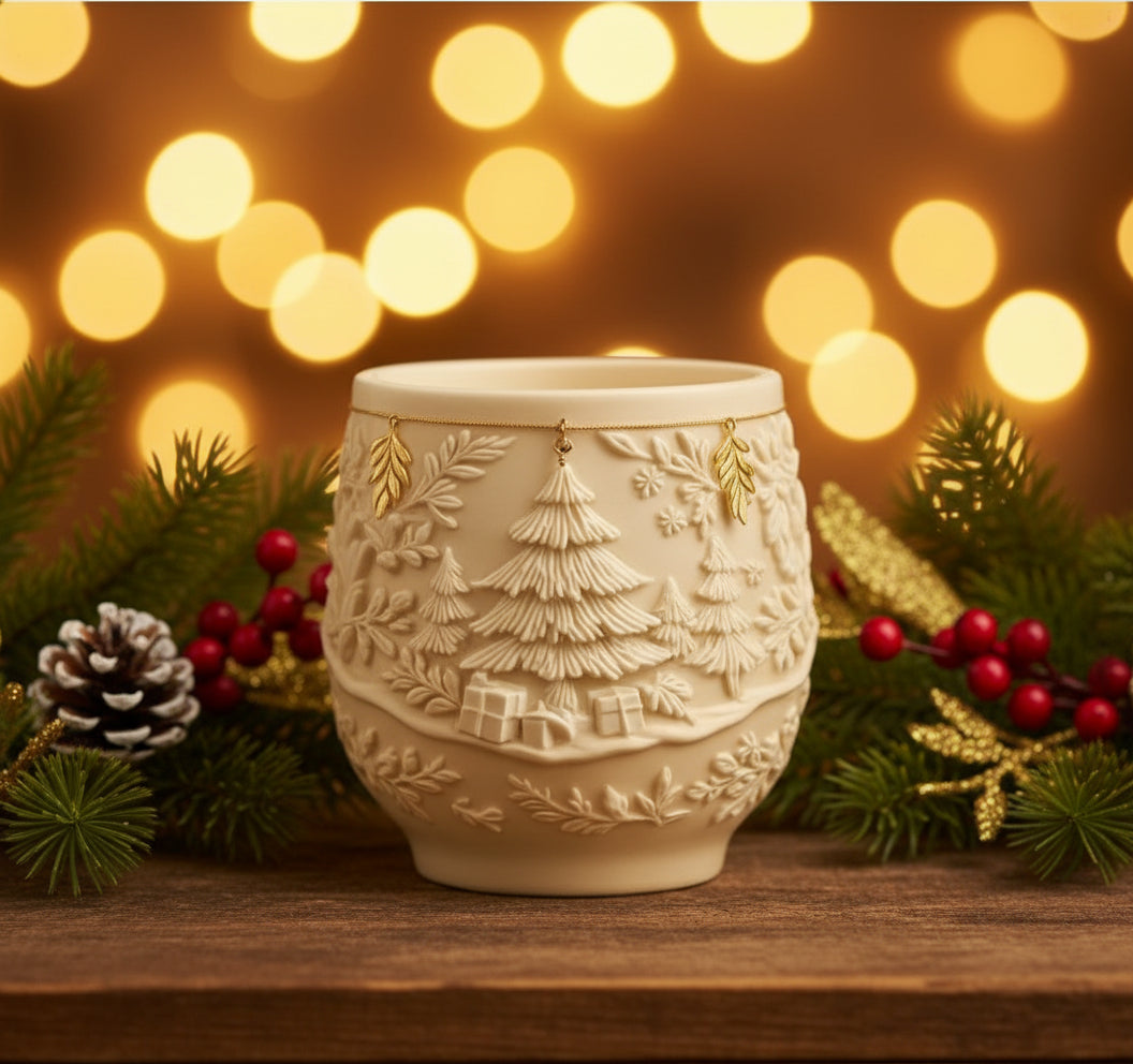 Χριστουγεννιάτικο κερί μέσα σε πορσελάνινο δοχείο με ανάγλυφα σχέδια στο άρωμα της επιλογής σας.